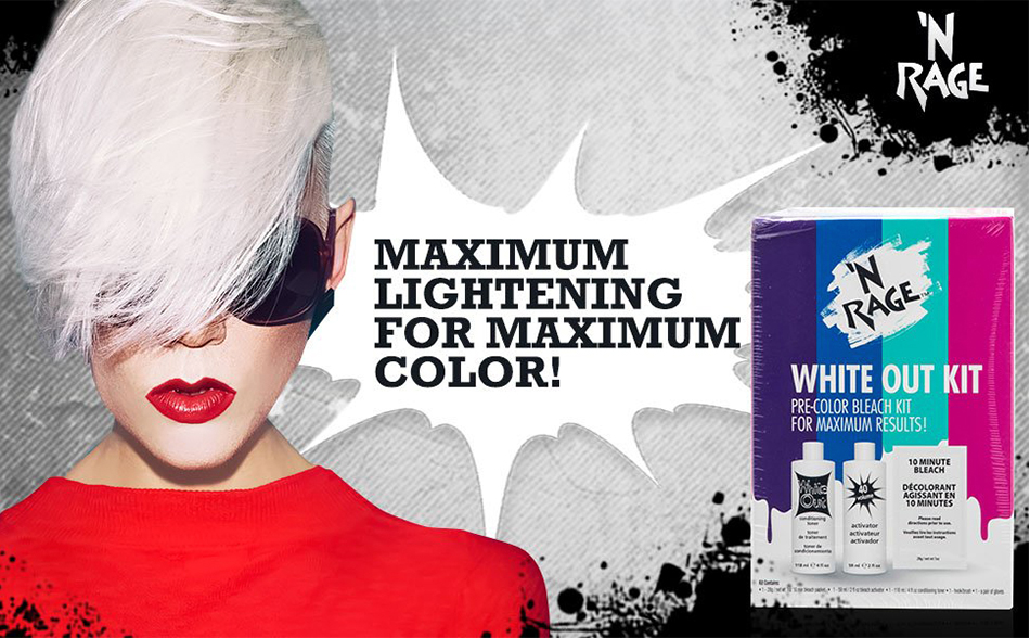 Achieve vivid, long-lasting 'N Rage color results by pre-lightening dark hair with this all-in-one kit. Our 2-step system takes bleaching to the next level. The off the scalp 10 Minute Bleach formula is activated with 40 Volume Acivator for fast lightening. The White Out Conditioning Toner helps to eliminate dullness resulting in a brighter white.